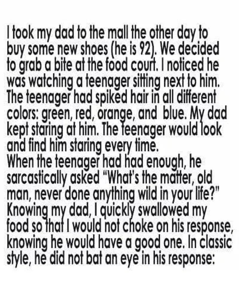 I took my 92-year-old dad to the mall recently to shop for new shoes. We grabbed a bite at the food court, where he quietly watched a teenager sitting nearby.