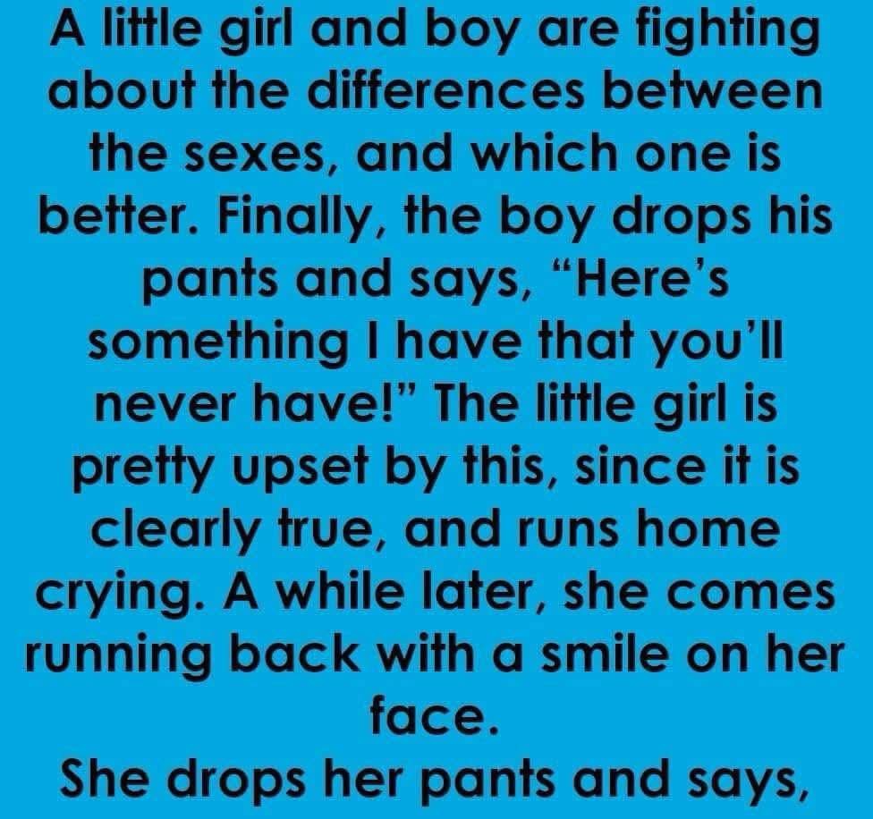 Finally, the boy drops his pants and says, “Here’s something I have that you’ll never have!”