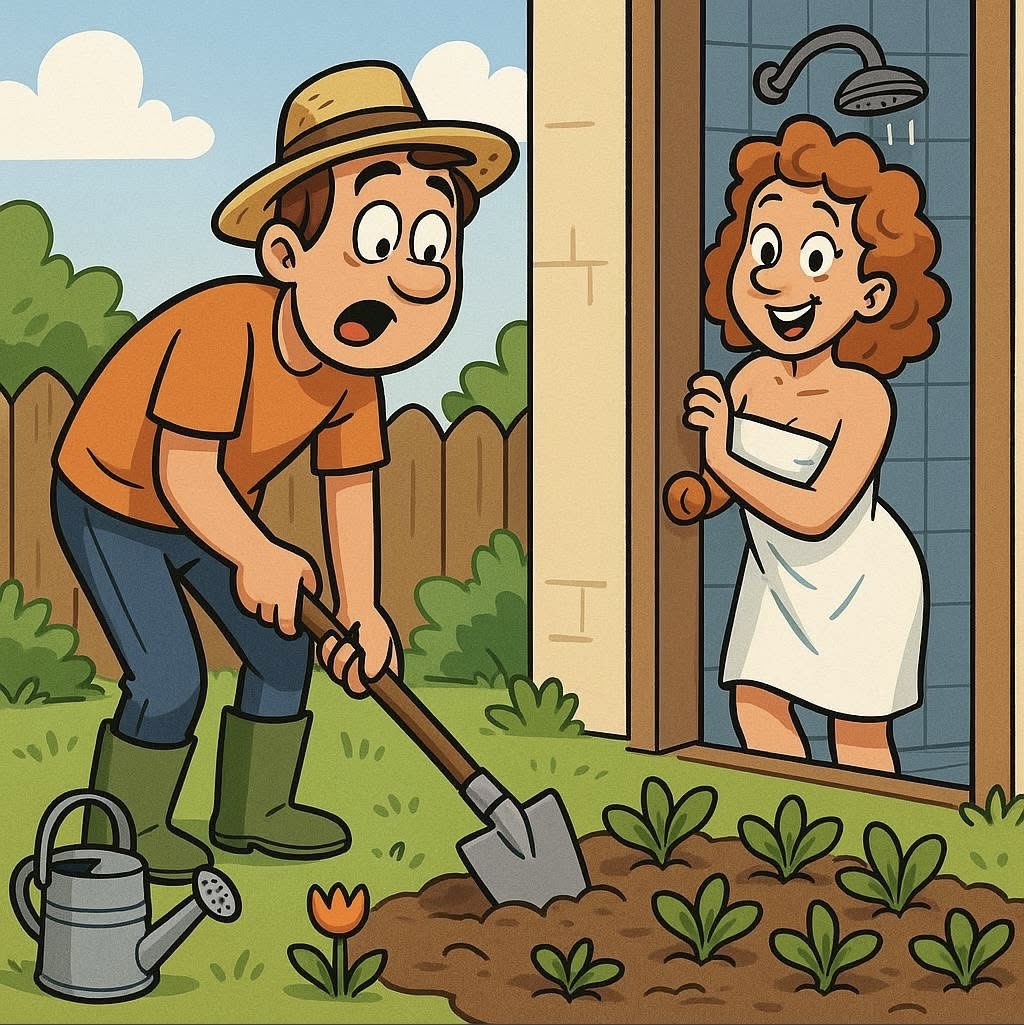 A man was working in the garden, and his wife was about to take a shower.