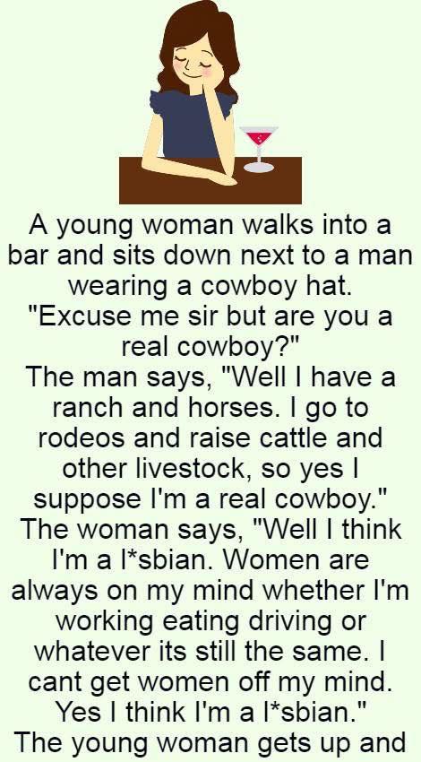 A young woman walks into a bar and sits down next to a man wearing a cowboy hat. “Excuse me sir but are you a real cowboy?” The man says, “Well I have a ranch and horses. I go to rodeos and raise cattle and other livestock, so yes I suppose I’m a real cowboy.” The woman says, “Well I think I’m a lsbian. Women are always on my mind whether