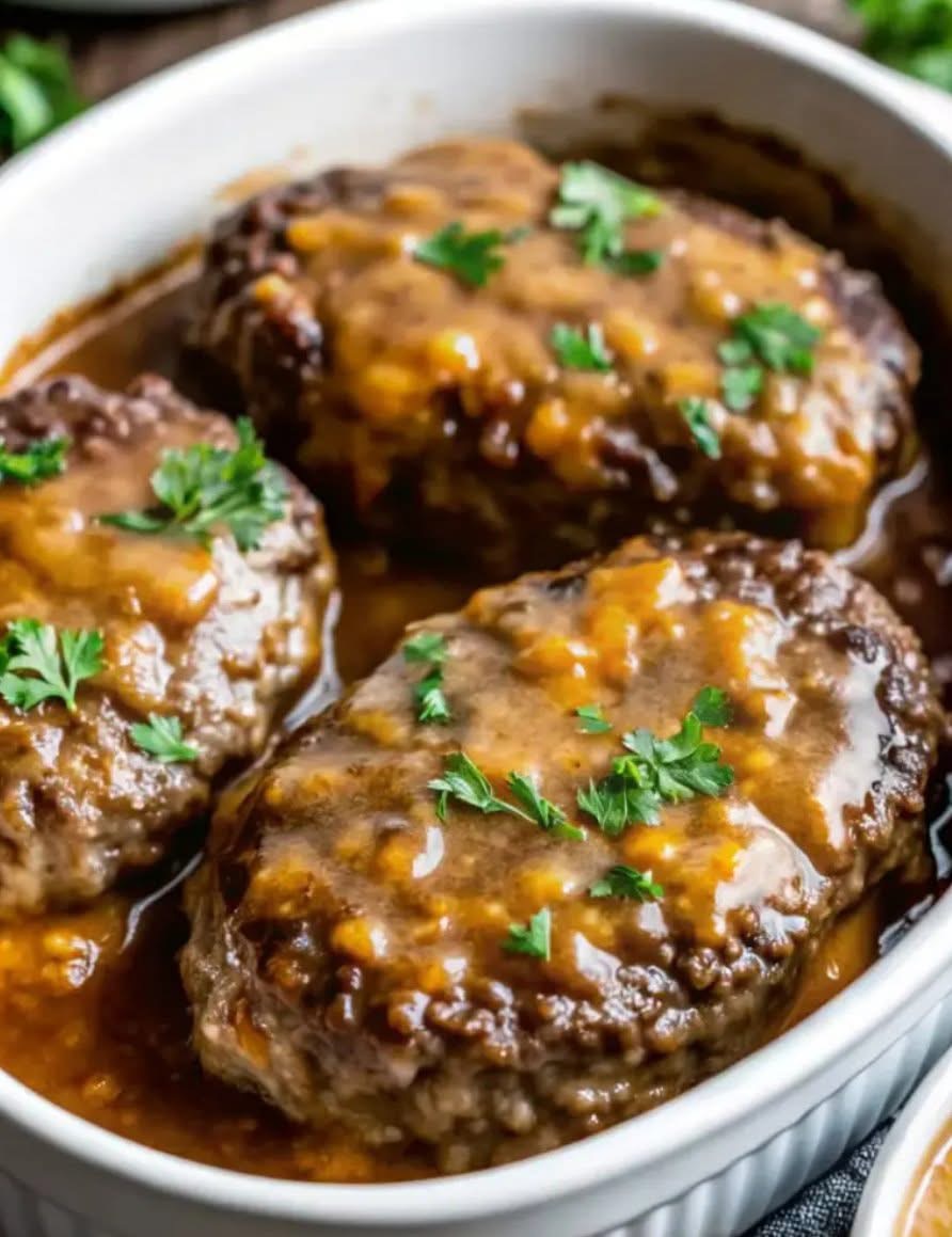 This comforting Amish Hamburger Steak Bake features seasoned ground beef patties browned for a crisp crust, then smothered in a rich cream of mushroom gravy and baked until tender.