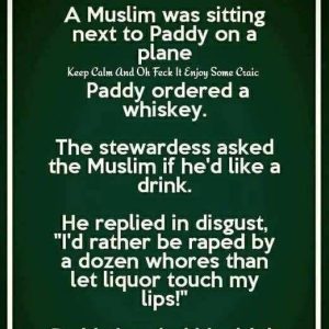 A Muslim was sitting next to Paddy on a plane. Keep Calm And Oh Feck It Enjoy Some Craic Paddy ordered a whiskey. The stewardess asked the Muslim if he’d… Read more