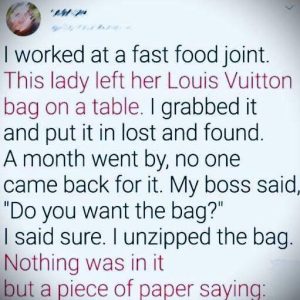 One day, while I was working at a fast food restaurant, this lady left her Louis Vuitton bag on the table. I waited about 20 minutes but remembered seeing her… Read more