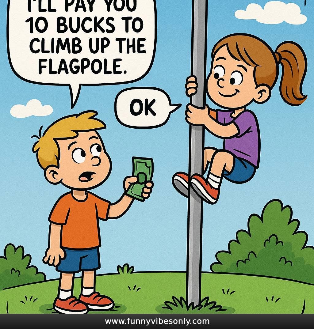 Boy: I’ll pay you 10 bucks to climb up the flagpole. Girl: ok. (climbs the flagpole) Girl: Mommy Mommy a boy paid me 10 bucks to climb the flagpole. Mom: He just wanted to see your underwear!
