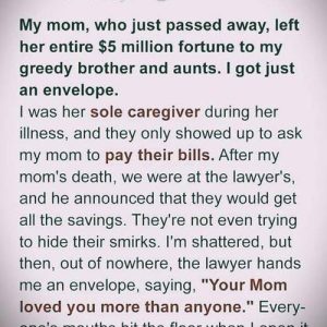 My mom, who just passed away, left her entire $5 million fortune to my greedy brother and aunts. I got just an envelope. I had been her caregiver through every… Read more