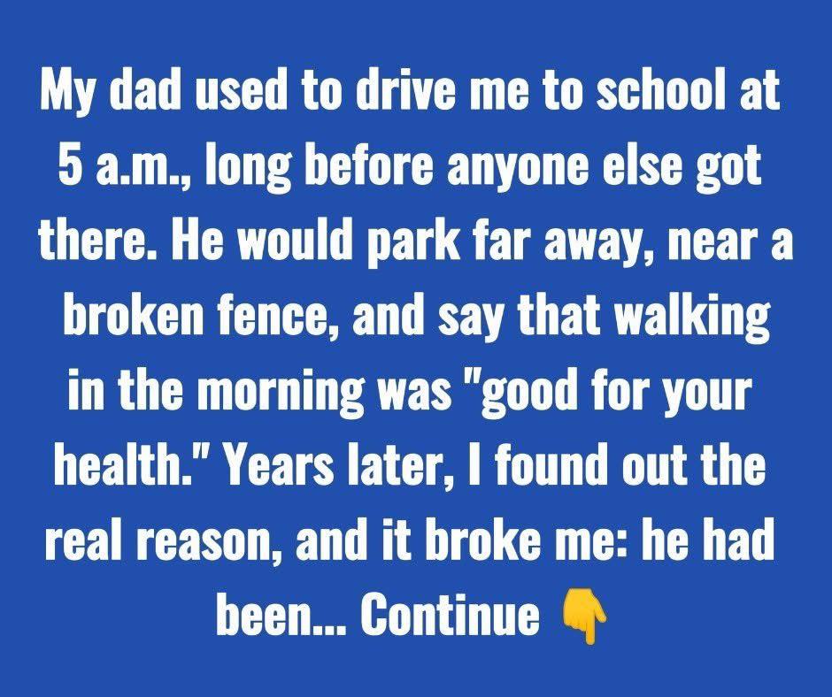 My dad used to drive me to school at 5:00 a.m., hours before anyone else got there. He would always park far away, near a broken fence, saying that walking in the morning mist was “good for us” and a nice way to start the day. One foggy morning, I asked him why we parked so far. He just said it was for the fresh air.