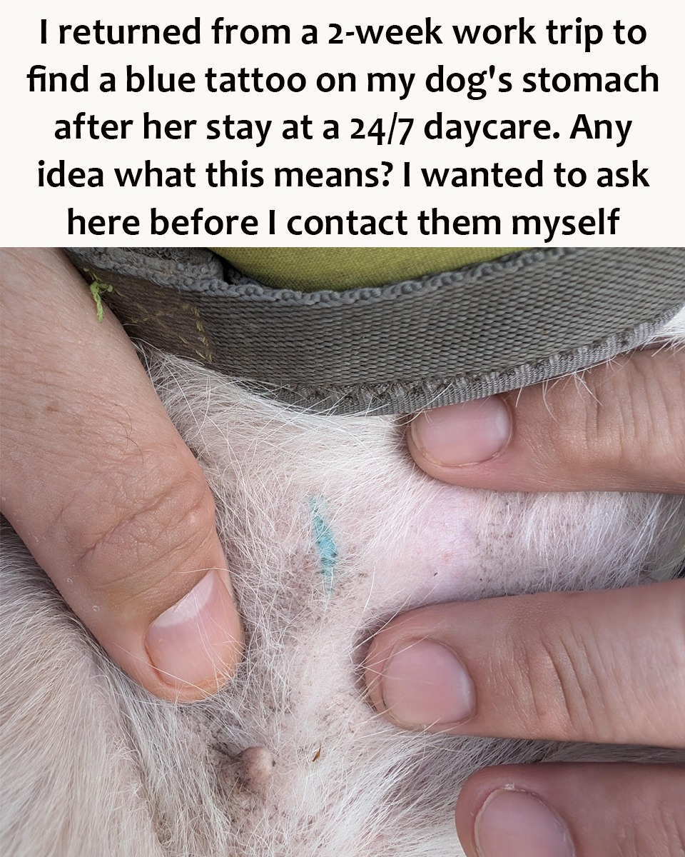 Returning home from a two-week work trip, you were eager to reunite with your beloved dog, who had been staying at a 24/7 daycare facility. However, upon closer inspection, you noticed something unusual—a blue tattoo on her stomach. This unexpected discovery has left you puzzled and concerned about what it might signify. Before jumping to conclusions, it’s important to gather information and understand the potential reasons behind this tattoo.