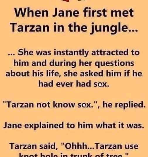 Curious about his life, she asked if he had ever had sex. Tarzan replied, “Tarzan not know sex.” Jane explained what it was,and Tarzan said, “Ohhh…Tarzan use