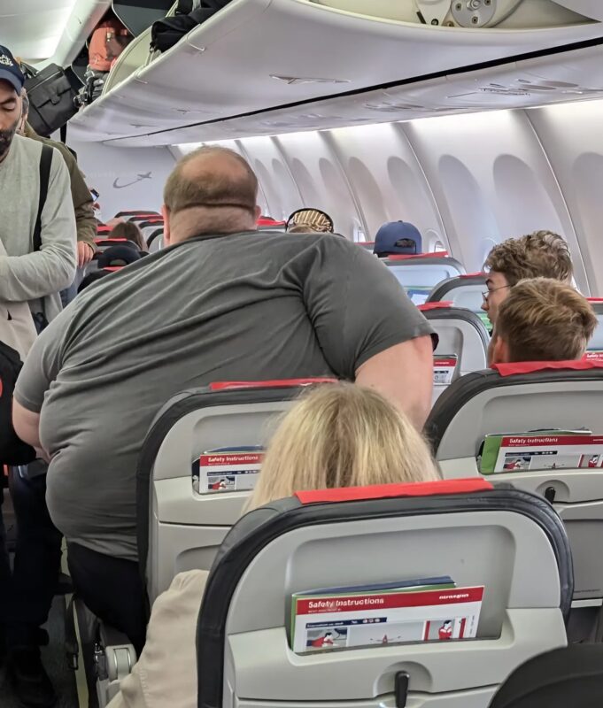 There were nearly all of the passengers on board. People were rushing to find their seats, putting their things in the overhead bins. As soon as a man in a gray T-shirt sat down along the aisle, it became evident that there wasn’t enough room for him.