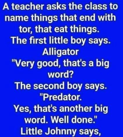 In a classroom filled with eager young minds, a teacher decided to spark their creativity with an engaging word game. The challenge was to come up with words that end with “tor” and have an insatiable appetite for consuming things. The students excitedly raised their hands, ready to participate.