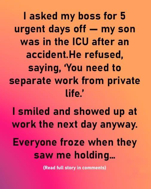 I asked for five urgent days off because my son was in the ICU in critical condition. My boss refused. He said, “You need to separate work from private life.” I smiled, slept a few hours, and showed up the next morning—pushing my son’s hospital bed through the lobby. IVs. Monitors. A nurse trailing me, startled but silent. The security guard tried to block me, and I told him, “Call Mr. Manson. He’ll want to see this.”