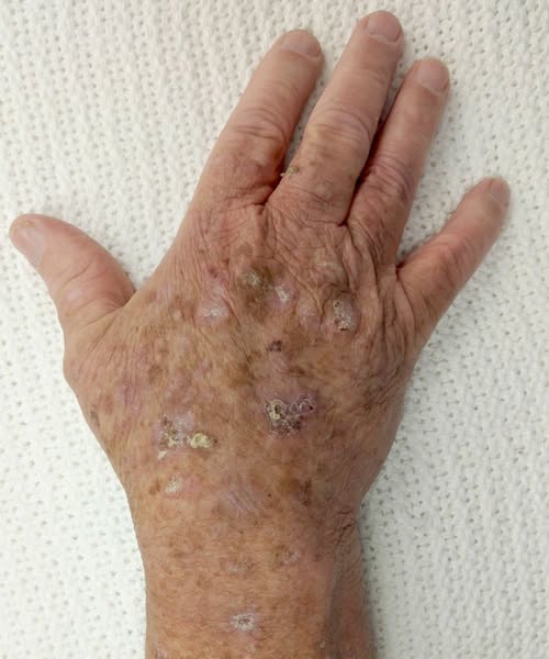 This type is considered precancerous. It usually appears as rough, dry, or scaly patches on areas of the skin that receive a lot of sun exposure, such as the face, ears, scalp, hands, and forearms. Actinic keratoses are caused by long-term exposure to ultraviolet (UV) radiation and have the potential to develop into squamous cell carcinoma if left untreated.