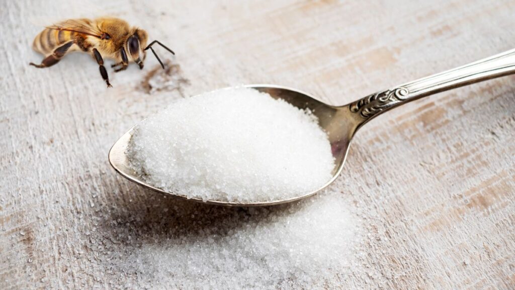 The Department of Primary Industries says that white sugar (sucrose) should be used to make up for honey that isn’t available in the hive and to keep colonies from going hungry.