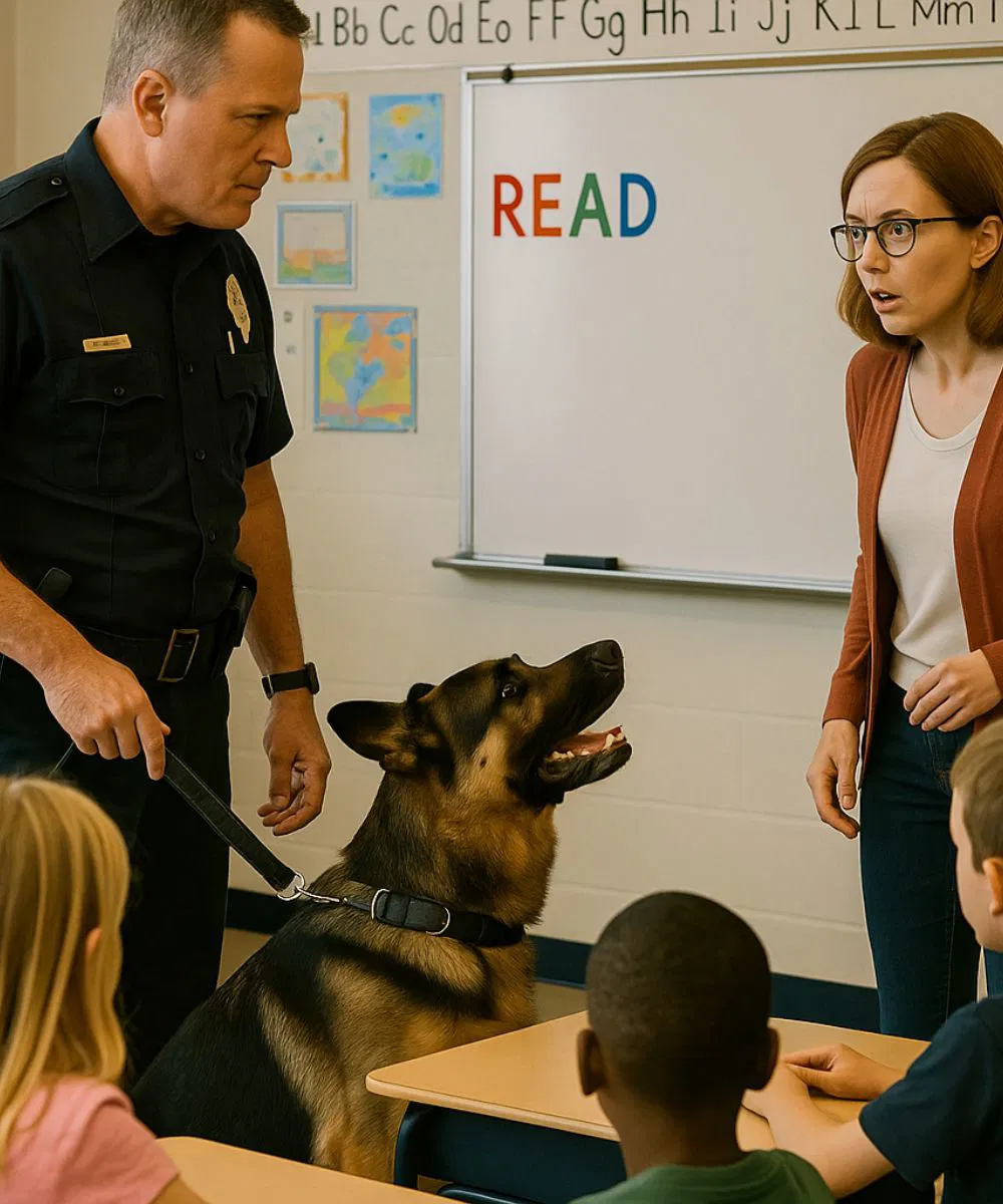 At first, the dog sniffed the air. Then, his body stiffened. He let out a low growl, lifted his head high — and suddenly began barking loudly, his gaze locked directly on the teacher. Confused murmurs spread through the room. The officer tried to calm him, but Ralf bolted toward the teacher, jumped up on his hind legs, and pressed his nose against her chest, barking sharply and relentlessly.