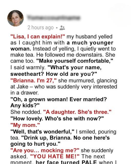 Lisa returned home early from a trip and sensed something was wrong when the house felt unnaturally quiet. Following a noise upstairs, she discovered her husband, Jake, with a younger woman named Brianna. Instead of reacting with anger, Lisa calmly invited them both to the kitchen for tea. Her composure shocked them, but she had long suspected Jake’s betrayal and had been preparing for this moment for years. Their marriage had always been more about convenience than love, and Lisa had wisely protected herself with a strong prenup.