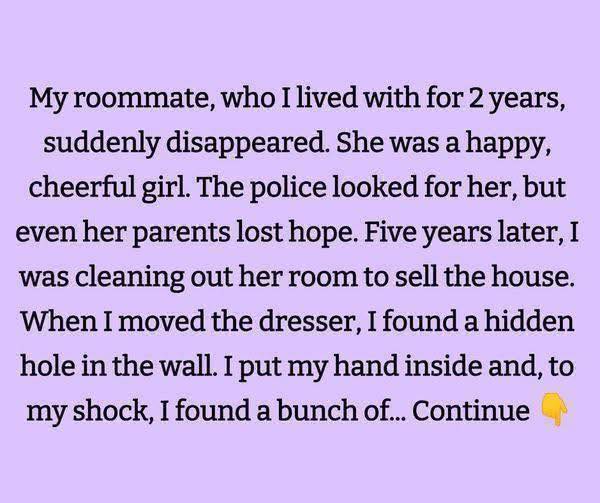 My roommate, who I lived with for 2 years, suddenly disappeared. She was a happy, cheerful girl. The police searched for her, but even her parents lost hope. Five years later, I was cleaning her room to sell the house. When I moved the dresser, I found a hidden hole in the wall. I put my hand inside and, to my horror, I found a bunch of notes that said, “If I ever disappear, you need to urgently look for me at Jake’s cabin in the mountains.”