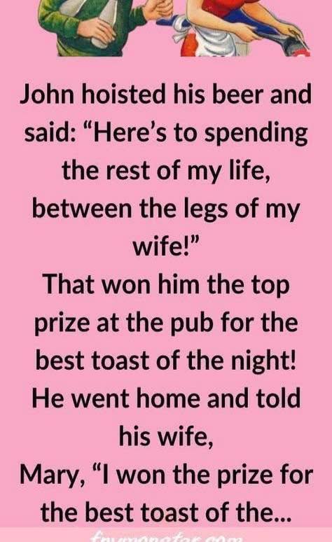 The next day, Mary ran into one of John’s drinking buddies on the street Corner. The man chuckled leeringly and said, “John won the prize the other night at the pub with a toast about you, Mary.”