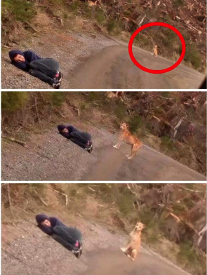 After a few more fruitless attempts, they devised a fresh plan to draw Bear when they found him in the same spot the following day. Amanda made the decision to “play it dead” by lying down on the ground in an attempt to convince the dog that she needed help.